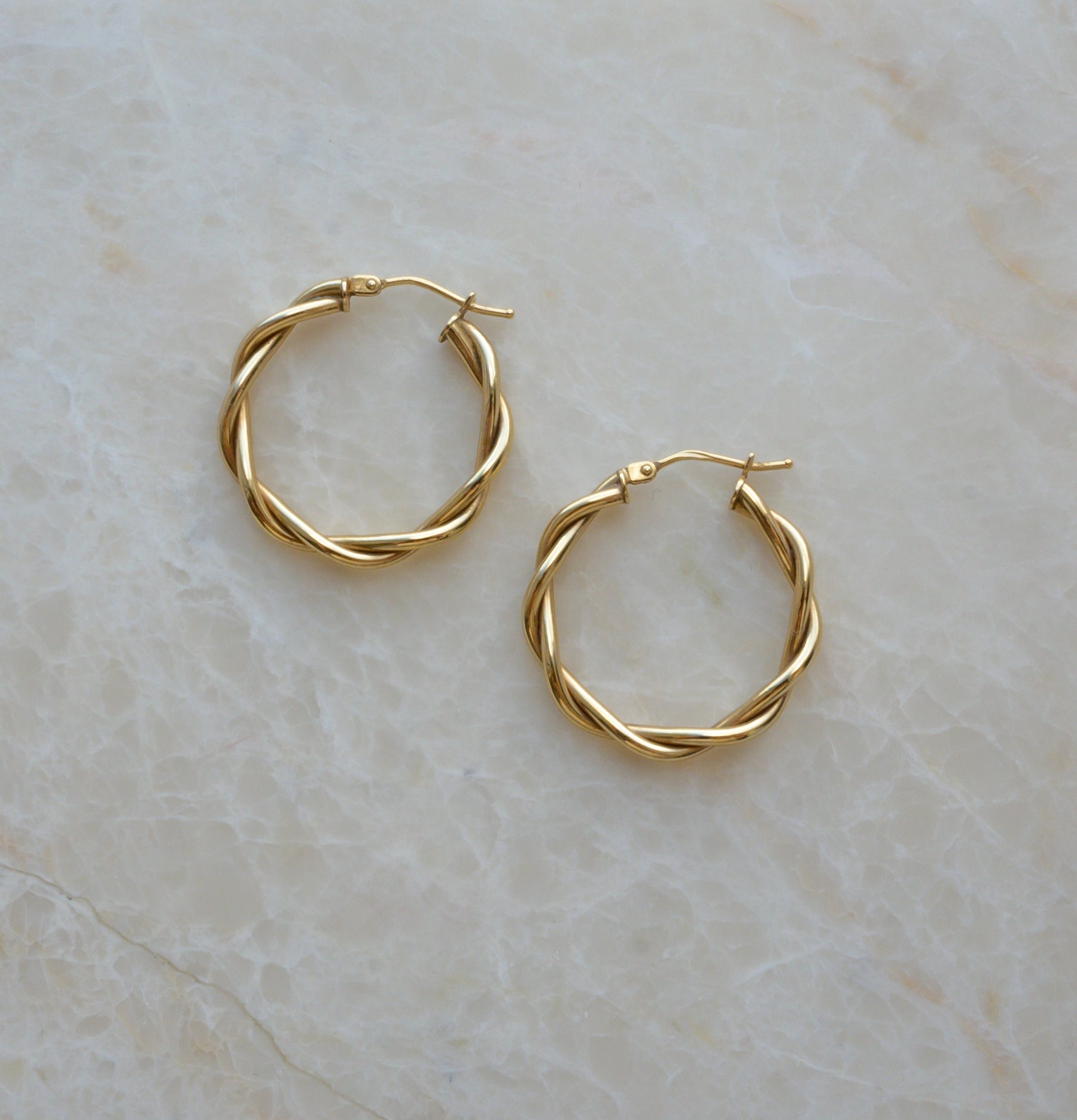 Lightweight hoop earrings made with twisted tube gold.